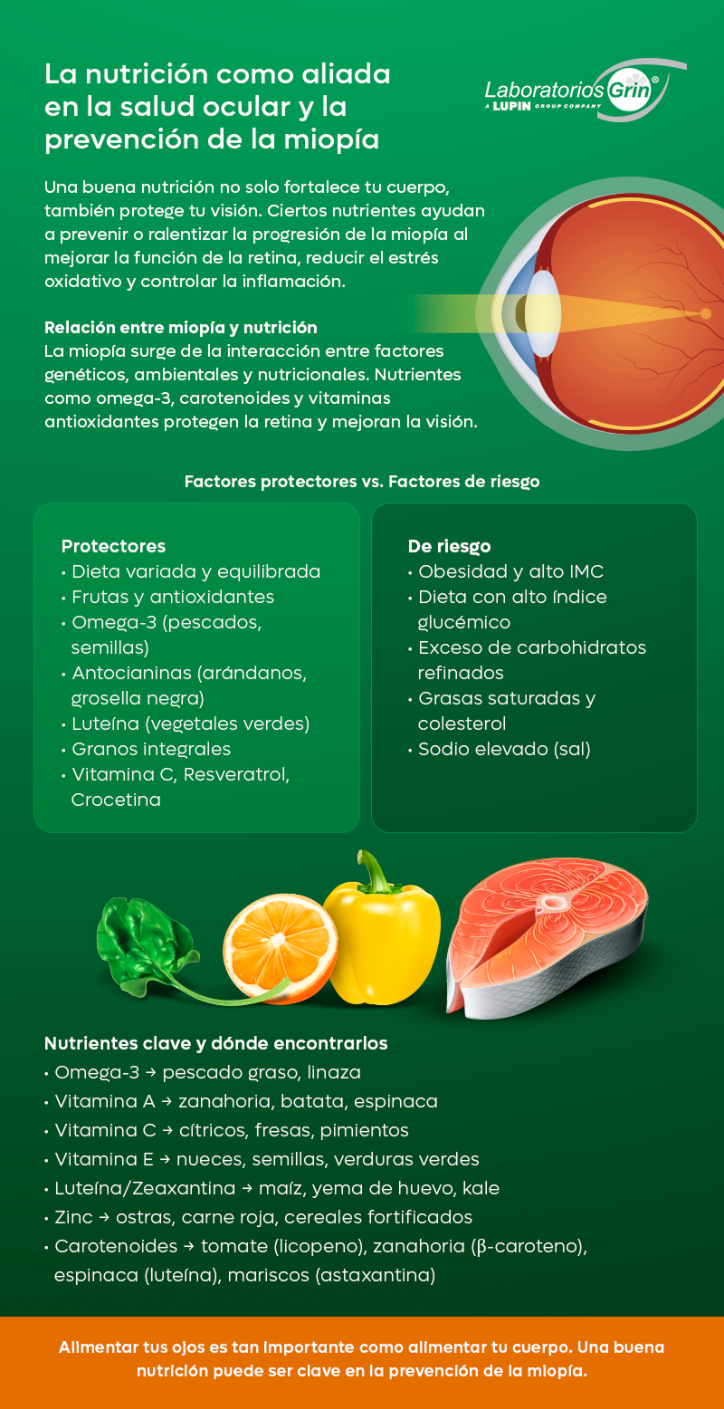 La nutrición desempeña un papel relevante en la salud ocular y en la modulación del riesgo de miopía, aunque los mecanismos específicos aún no están del todo claros. Una dieta variada y equilibrada, rica en antioxidantes, carotenoides, ácidos grasos omega-3 y micronutrientes esenciales, favorece la función retiniana, protege frente al daño oxidativo e inflamatorio y contribuye a mantener la integridad estructural del ojo. Por el contrario, la obesidad, las dietas con alto índice glucémico, el exceso de carbohidratos refinados, grasas saturadas y sodio se asocian con mayor riesgo de elongación axial y progresión de la miopía. Así, promover patrones dietéticos saludables no solo fortalece la salud general, sino que también constituye una estrategia prometedora y complementaria para la prevención y el manejo de la miopía en distintas etapas de la vida.